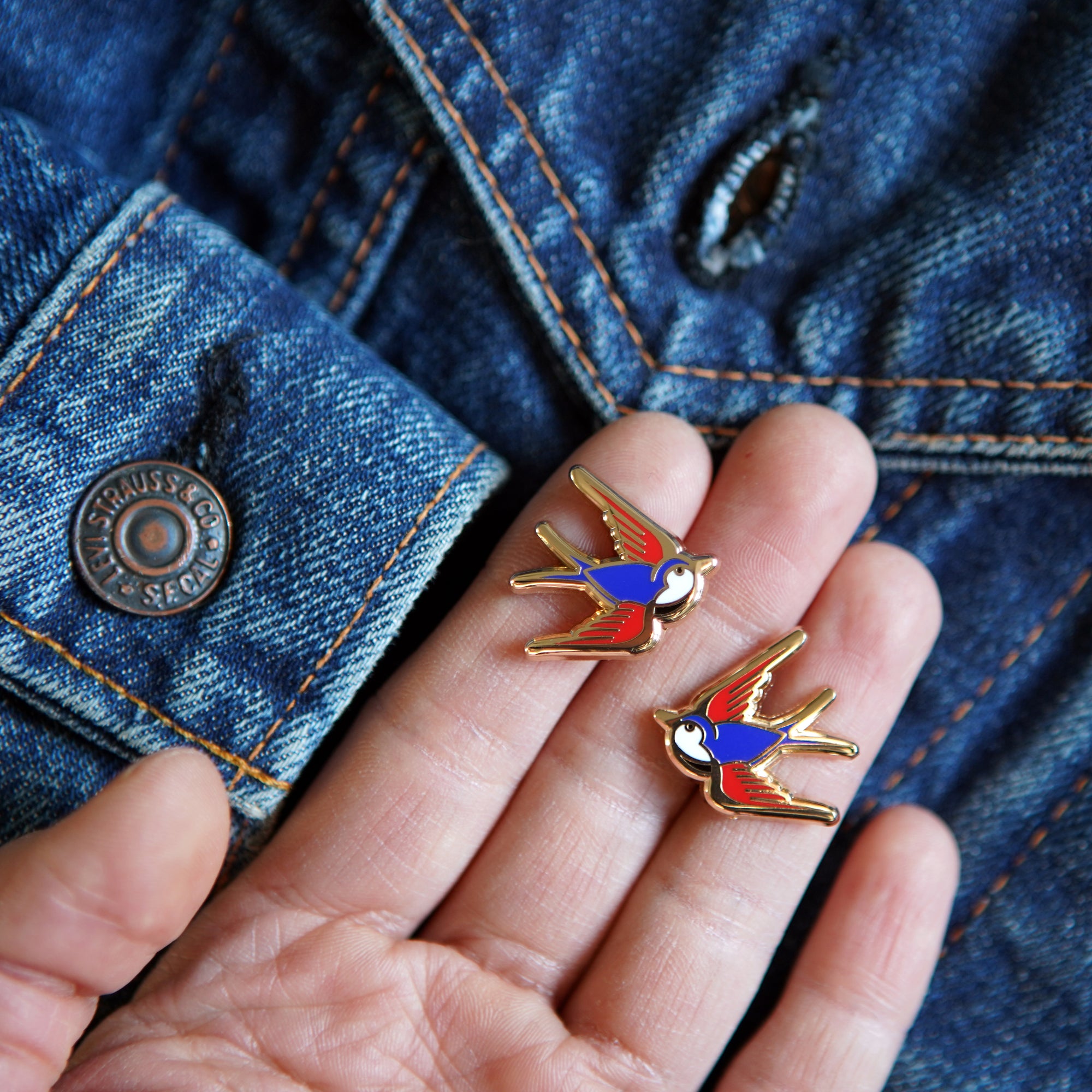 These two tiny birds in traditional tattoo-style are the perfect finishing touch for your collars. Set them on your shoulders to guide your way home — or give one to a friend or lovebird.